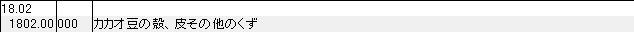 HSコードのうち「1802 カカオ豆の殼、皮、その他のくず」のカテゴリーに入る、6ケタ、9ケタ細分類のHSコードと品名の詳細一覧です。豆そのものは前項に該当します。