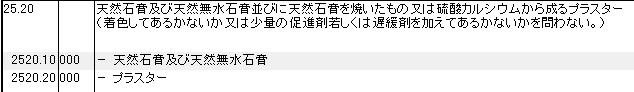 HSコードのうち「2520 天然石膏、天然無水石膏、天然石膏を焼いたもの、硫酸カルシウムから成るプラスター」のカテゴリーに入る、6ケタ、9ケタ細分類のHSコードと品名の詳細一覧です。促進剤の添加や着色の有無は無関係です。